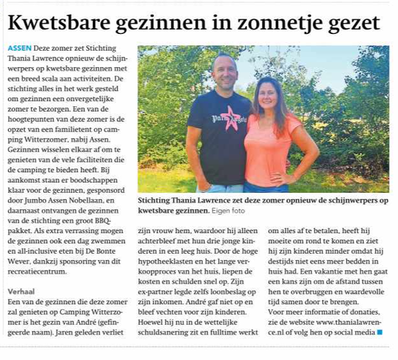 Als extra verrassing mogen de gezinnen ook een dag zwemmen en all-inclusive eten bij De Bonte Wever, dankzij een gulle sponsoring van dit recreatiecentrum. De Bonte Wever heeft al vaker succesvol samengewerkt met Stichting Thania Lawrence en draagt graag bij aan de maatschappij.